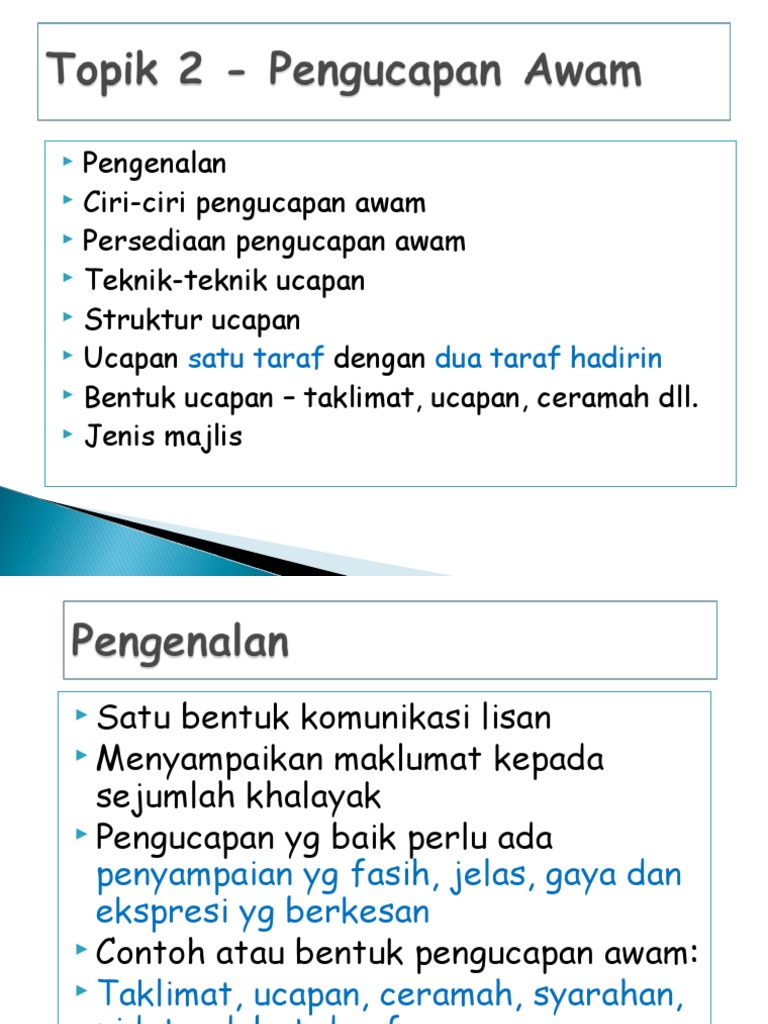 Sebagai contoh situasinya kita ada idea yang bernas yang dapat membantu memudahkan kerja seterusnya meningkat jualan di syarikat kita bekerja. Pertembungan mata Pengucap yang baik sentiasa focus dan melihat audiens Pandai membaca reaksi audiens Mata bertemu mata. Pengucapan umumPengucapan umum Pengenalan Ciri-ciri pengucapan umum Pengucapan umum yang berkesan Teknik-teknik ucapan Struktur ucapan Contoh-contoh ucapan satu taraf hadirin dengan dua taraf hadirin.