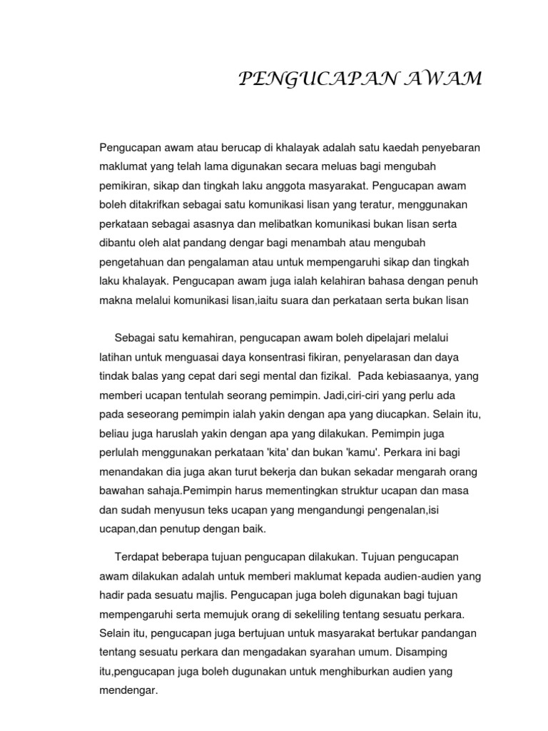 ABSTRAK Penulisan ini memperkata mengenai perkara-perkara umum dalam penggunaan bahasa penentuan format pemilihan bahan seta tatacara penulisan dan penyampaian ceramah ucapan dan taklimat atau yang disebut perucapan yang. Hunt 1987 Perucapan Awam merupakan proses penyampaian buah fikiran maklumat pandangan dan perasaan kepada para hadirin dengan menggunakan lambang-lambang bahasa Mat Jizat Abdol 1992 Perucapan umum tergolong kepada segala bentuk persembahan ucapan syarahan dan juga ceramah 3. Suatu teks yang berisi tentang pendapat atau gagasan yang disampaikan.