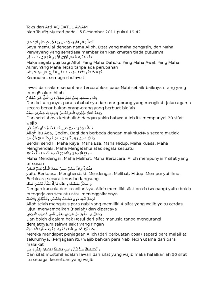 Aqidatul awam dan artinya. Lirik sholawat Aqidatul Awam ini diawali dari bentuk pujian kepada Allah Azza wa Jalla kemudian dilanjutkan kepada para Nabi. Aqidatul awam aqidatul awam yaitu disorientasi satu kitab yang membahas mengenai tauhid karya ulama besar dan waliyullah syeikh sayyid ahmad al marzuqi al maliki al hasani. Terlebih bagi mereka yang baru pertama mengenal Islam.